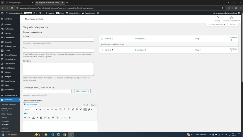 Las etiquetas sirven como palabras clave adicionales. Puedes usarlas para materiales, colores, temporadas, etc.