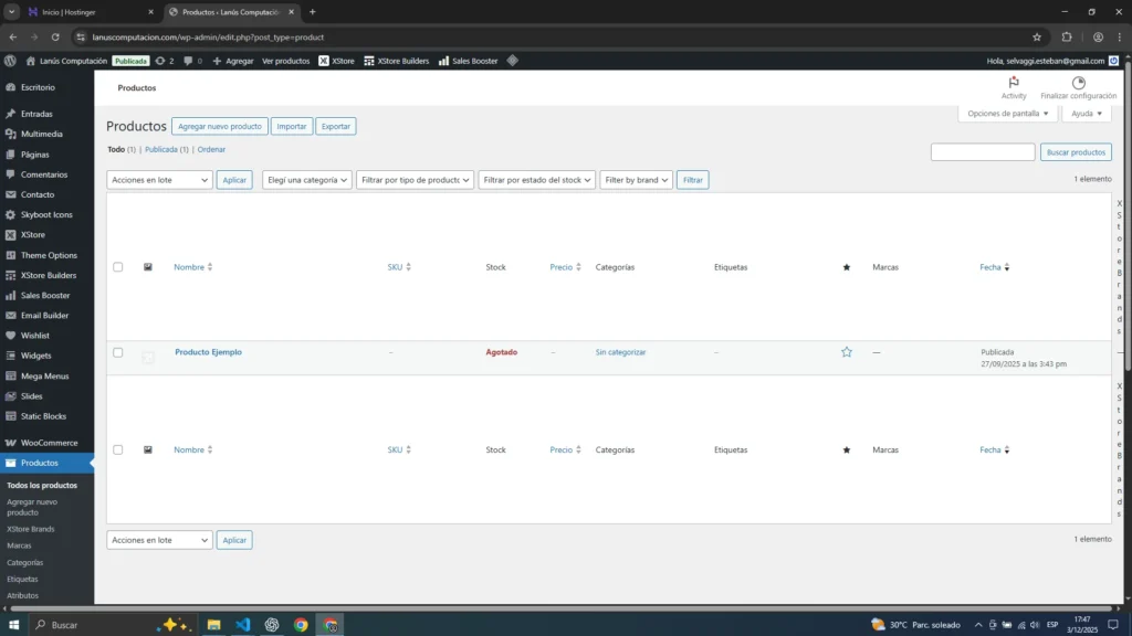 Verás una tabla con todos los productos, donde se muestra el nombre, SKU, stock, precio y estado (publicado, borrador, etc.).